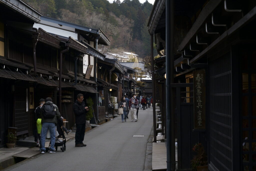 出格子や低い軒が連なる高山特有の美しい町並みに、店舗や飲食店が並びます。